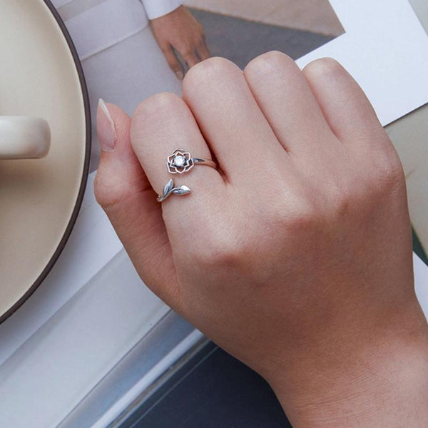 BSR325 Sterling Silver S925 Silver Camellia Zirconia Ring(Open Adjustable)