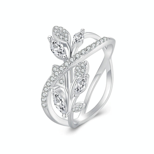 BSR453-7 S925 Sterling Silver White Gold Plated Zircon Luxury Leaf Ring