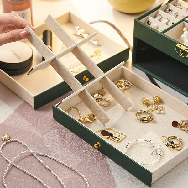 Diamond Pattern PU Leather Three-layer Drawer Jewelry Box Necklace Ring Jewelry Storage Box(Dark Green)