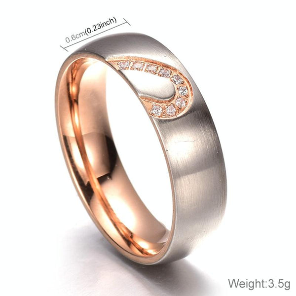 Fashion Rhinsetone Love Heart Splice Couples Ring Fine Titanium Steel Ring for Men and Women(Gold with Diamond, US Size: 8)
