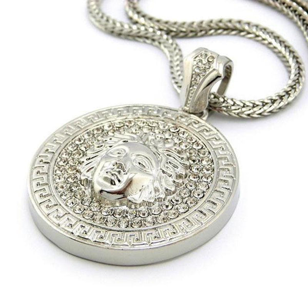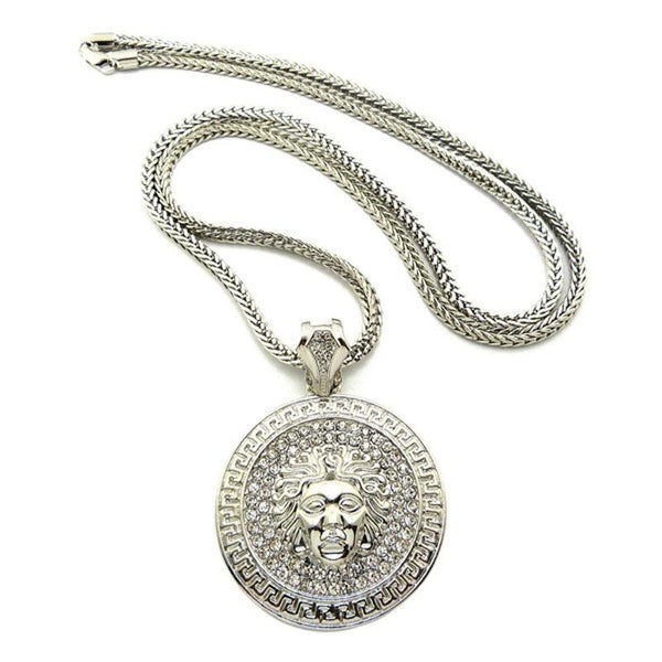 Hip Hop Round Medusa Head Zircon Rhinestone Pendant Clavicle Chain Necklace for Men, Chain Length: 90cm(Silver)