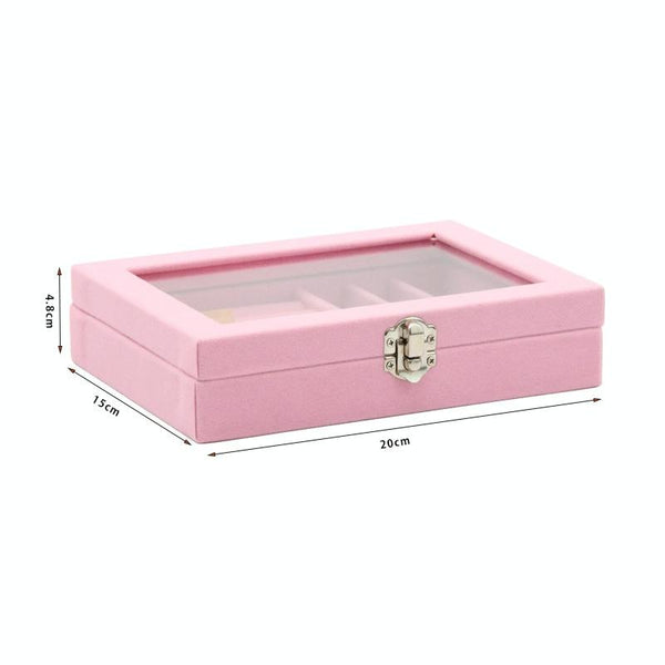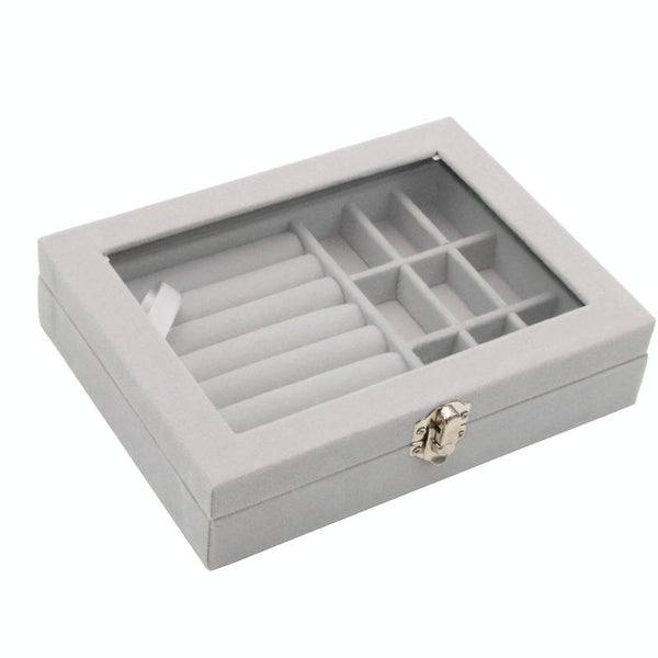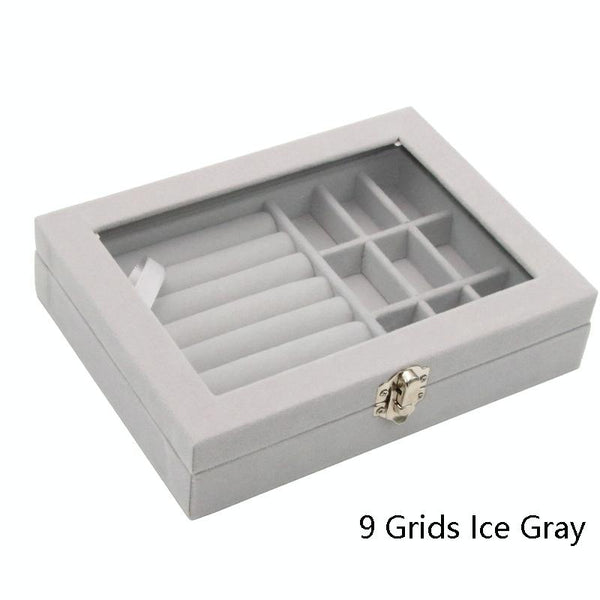 Home Glass Lid Flannel Storage Jewelry Box With Lid(9 Grids Ice Grey)