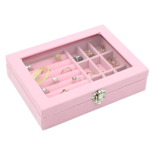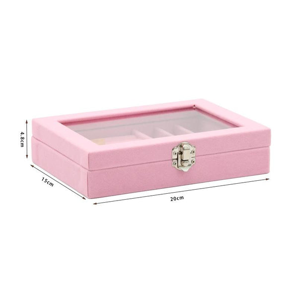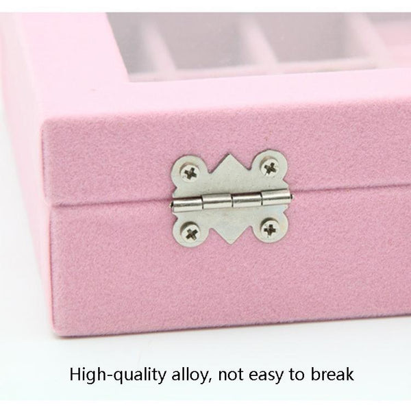 Home Glass Lid Flannel Storage Jewelry Box With Lid(9 Grids Pink)