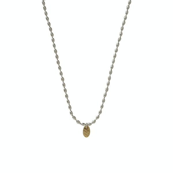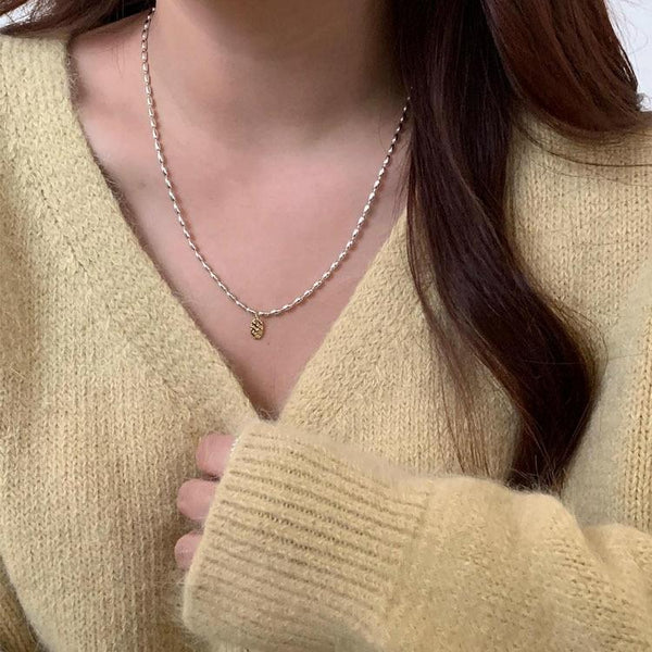4. The chain is in the shape of a special silver rice grain, and the pendant is a golden irregular oval with LOVE lettering on it