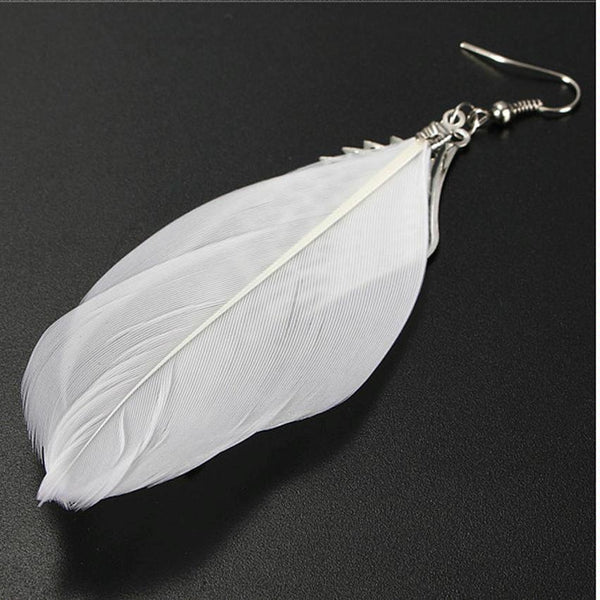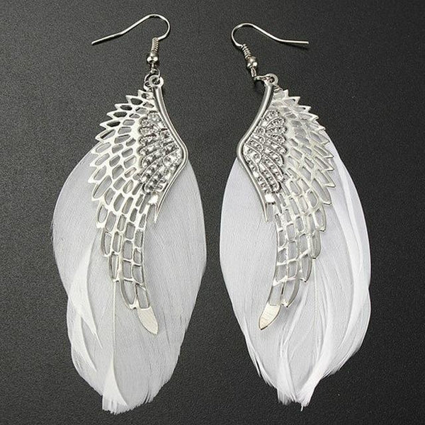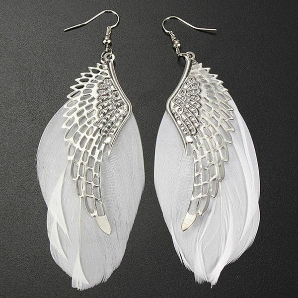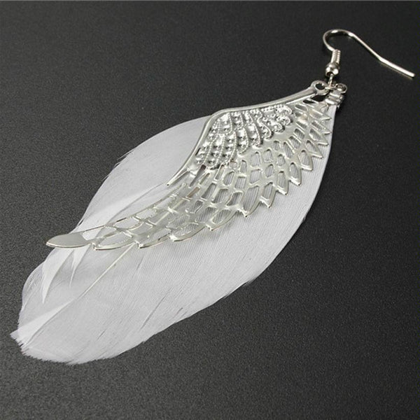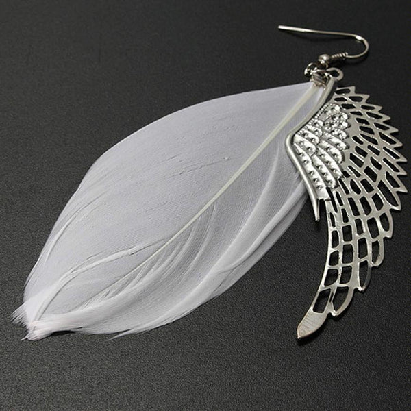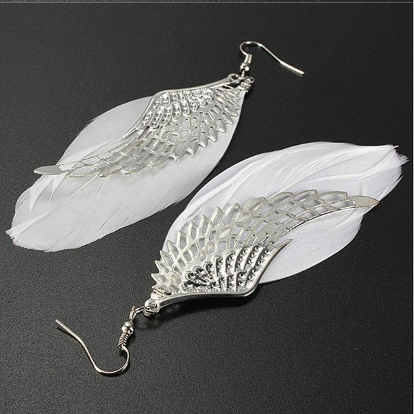 Metal Wing Earrings Bohemian Handmade Vintage Feather Long Drop Earrings(White)