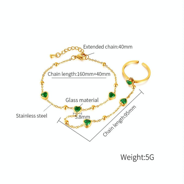 OPK GS1558 2 In 1 Emerald Heart Zirconia Stainless Steel Ring Bracelet