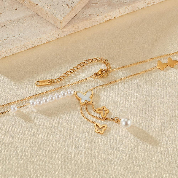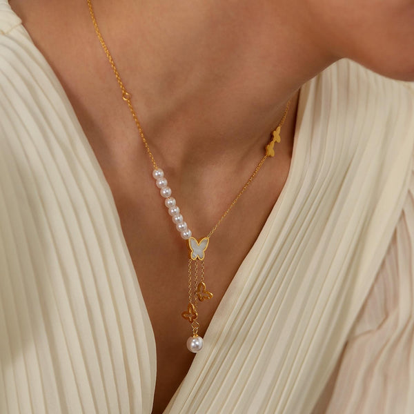 OPK GX2433 Vintage Hollow Butterfly Tassel Pearl Pendant Stainless Steel Necklace