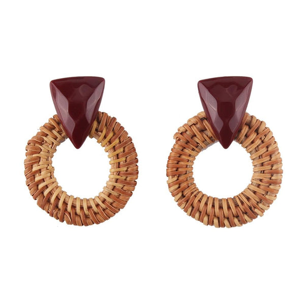 Rattan Wooden Vintage Handmade Dangle Earrings(Wine Red)