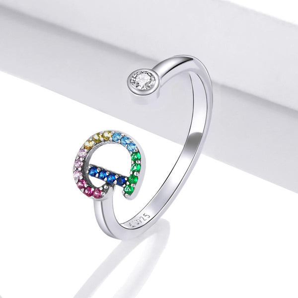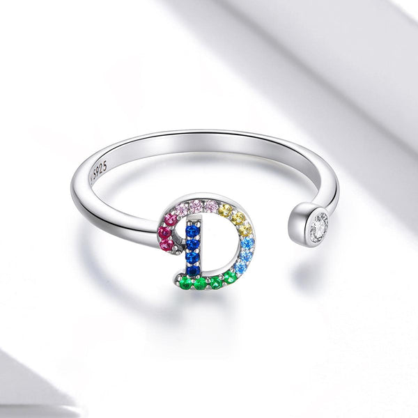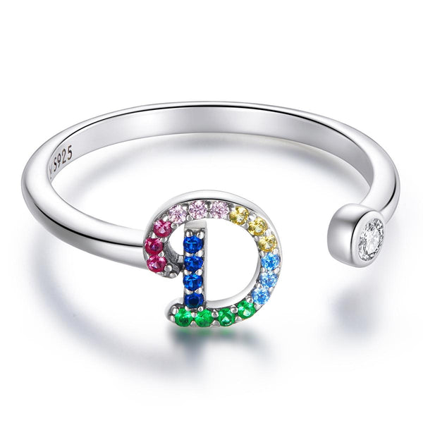 S925 Sterling Silver 26 English Letters Colorful Zircon Women Open Ring, Style:D