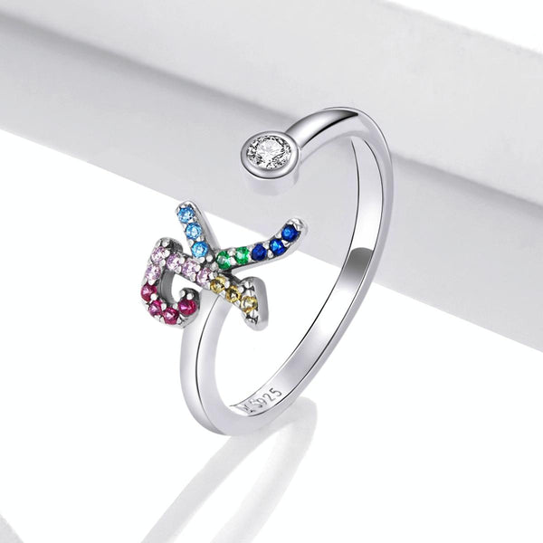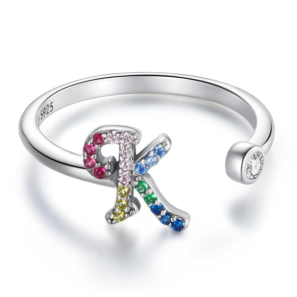S925 Sterling Silver 26 English Letters Colorful Zircon Women Open Ring, Style:K