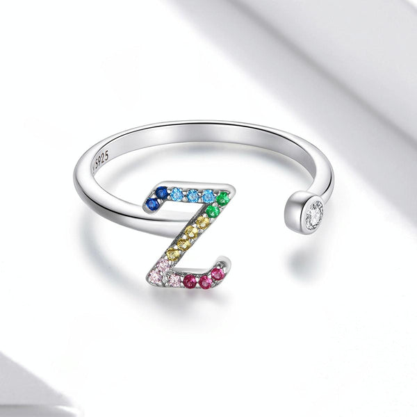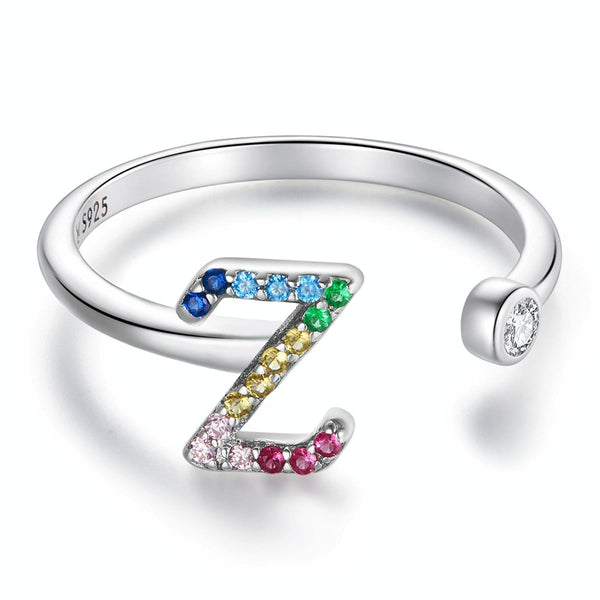 S925 Sterling Silver 26 English Letters Colorful Zircon Women Open Ring, Style:Z