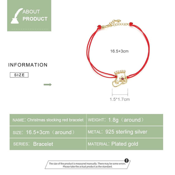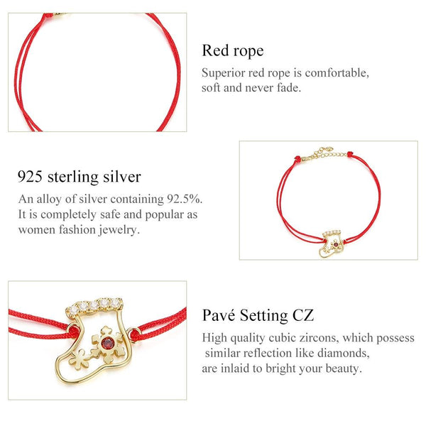 S925 Sterling Silver Christmas Socks Red Rope Bracelet Women Jewelry