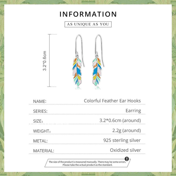 S925 Sterling Silver Colorful Feather Ear Hook Women Earrings