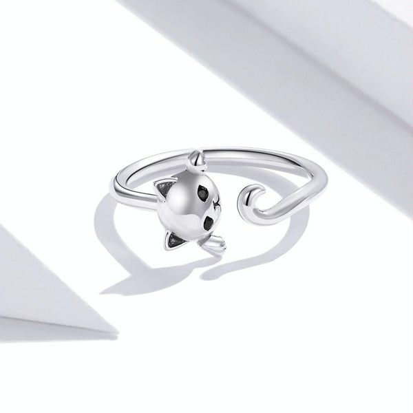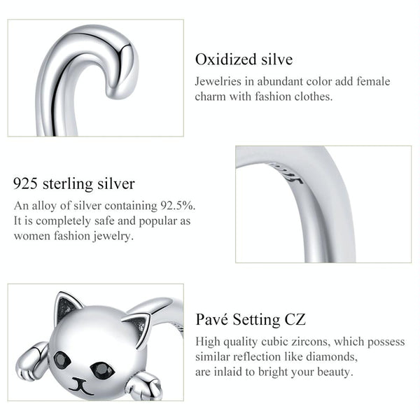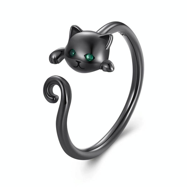 S925 Sterling Silver Cute Cat Women Open Ring (Black)