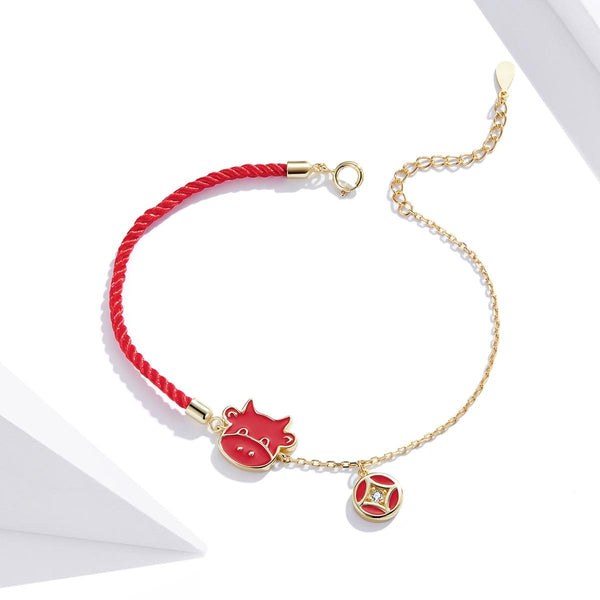 S925 Sterling Silver Red Rope Cute Cow Women Bracelet Jewelry
