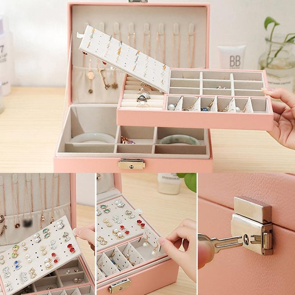 Simple Double-Layered Wooden Leather Jewelry Box With Lock Earrings Jewelry Box(White)
