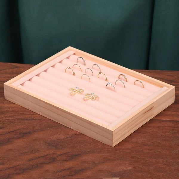 Solid Wooden Velvet Jewelry Display Tray Ring Earring Bracelet Storage And Organization Box, Specification: Small Beige
