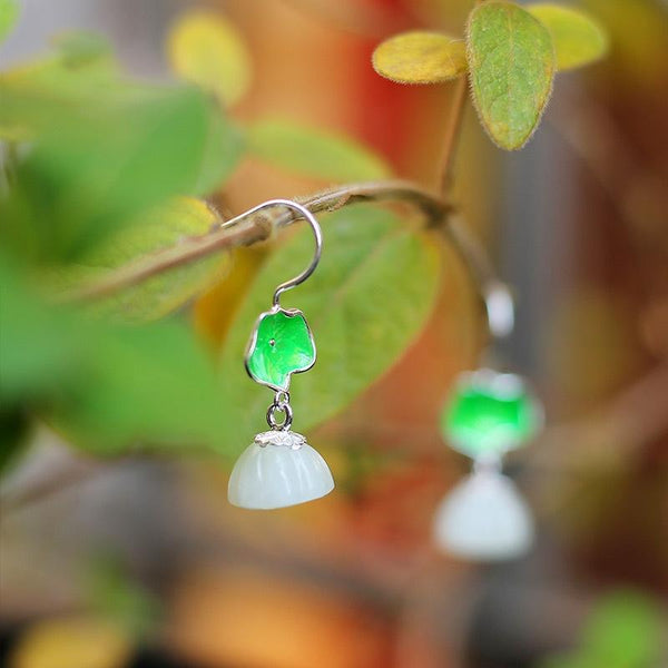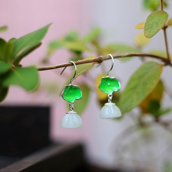 Sterling Silver Natural Hetian Jade White Jade Lotus Inlaid Cloisonne Earrings