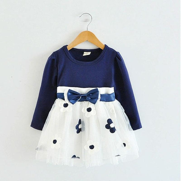Autumn Girls Flower Bow-knot Long Sleeve Dress, Size:110cm(Dark Blue)