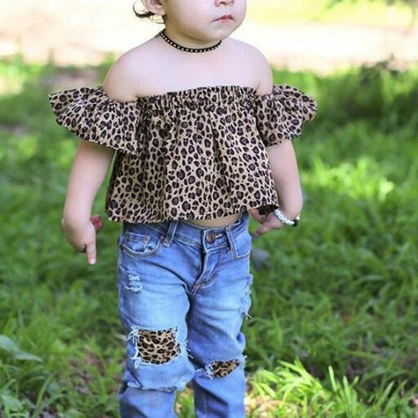 Girls Leopard Print Tube top + Denim Trousers + Hair Band Set, Kid Size:120cm(Leopard)