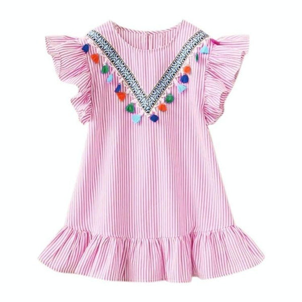 Girls Neckline Tassel Vertical Stripes Ruffled Dress, Height:90cm(Pink)