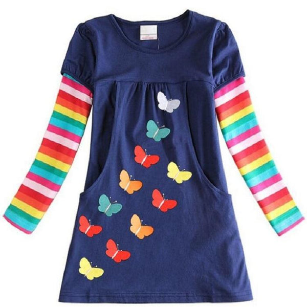 Girls Rainbow Long Sleeve Butterfly Embroidered Pattern Cotton Princess Dress, Size:122cm(Royal Blue)