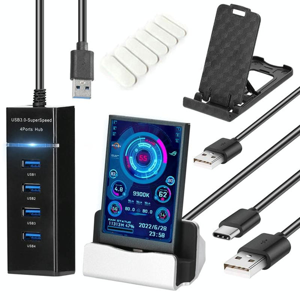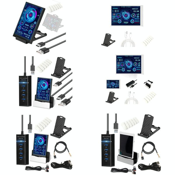 5. Packing list: package 1:3.5 inch IPS sub-screen + 1.5 m Type-C data line + adjustable bracket + acrylic non-trace double-sided adhesive; Package 2:3.5-inch IPS secondary screen + 1.5 m Type-C data line + adjustable bracket + acrylic non-traceable double-sided adhesive + USB four-port distributor + Type-C charging base; Package 3:3.5-inch IPS secondary screen + 1.5 m Type-C data line + adjustable bracket + acrylic non-traceable double-sided tape + USB four-port distributor + Type-C charging base + elbow data line Type-C + 4PIN Motherboard adapter line 9 pins
