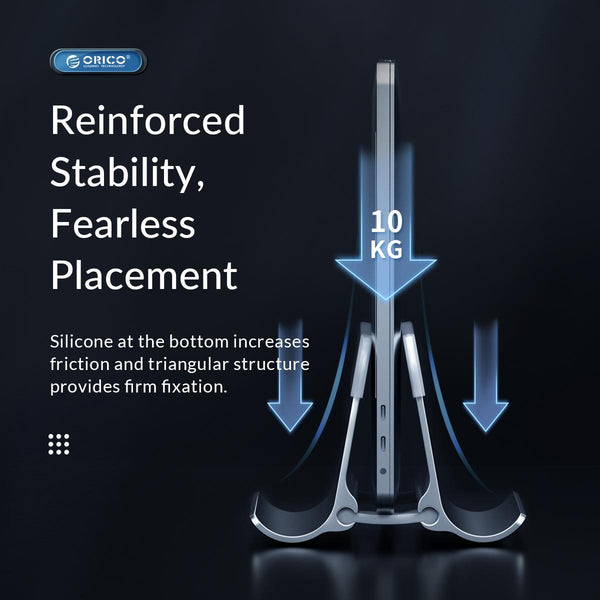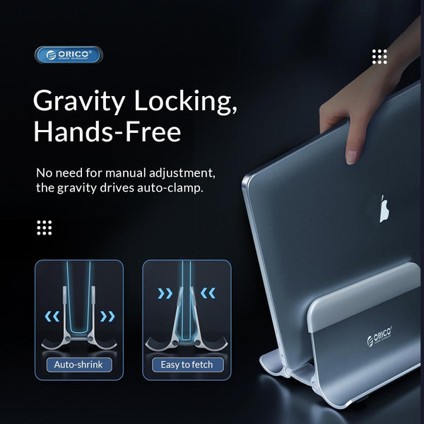 1. Gravity Locking Stand: ORICO vertical laptop stand with gravity locking design can lock your laptop automatically just by placing it on this stand, no adjustment required.