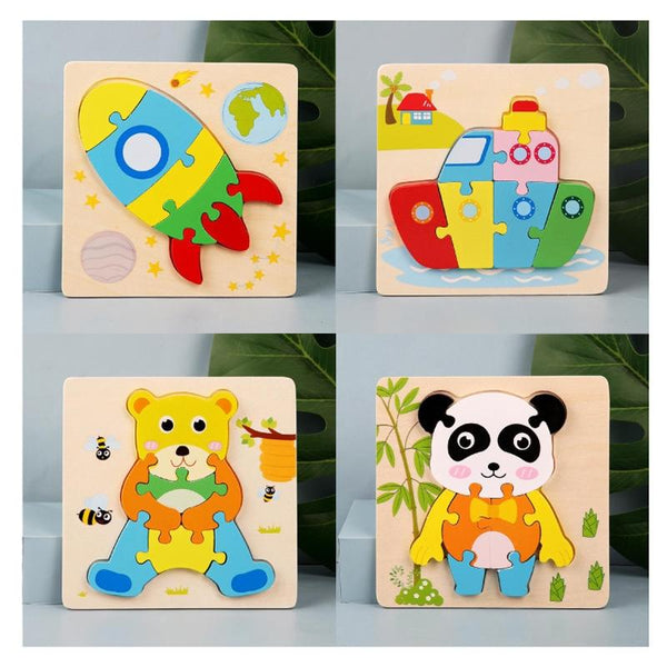 4 PCS / Sets Of Children Early Education Three-Dimensional Wooden Animal Puzzle Toys(Panda + Bear + Rocket + Ship)