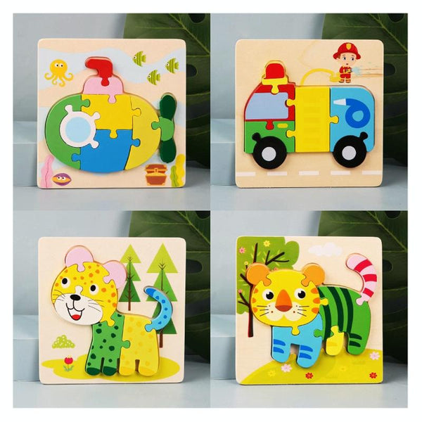 4 PCS / Sets Of Children Early Education Three-Dimensional Wooden Animal Puzzle Toys(Tiger + Kitten + Submarine + Ambulance)