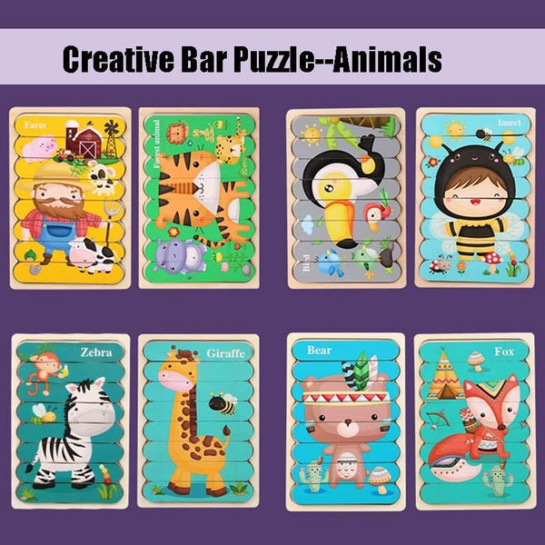 QBT01 Children Double-Sided Wooden Puzzle Bar Puzzle Toy(Bear + Fox)