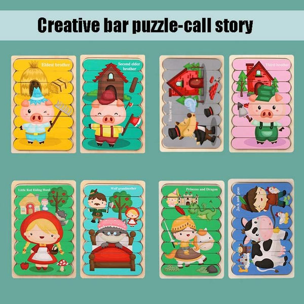 QBT01 Children Double-Sided Wooden Puzzle Bar Puzzle Toy(Big Gray Wolf + Pig (Pink))