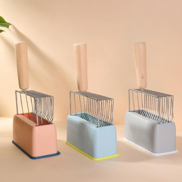 Effortlessly keep your cat's litter tray clean with this durable Metal and Wooden Handle Cat Litter Scoop. Featuring a large shovel surface and optimally sized apertures, this scoop efficiently collects clumps without shaking or dropping litter. The sturdy base (random colour) provides convenient storage and keeps the scoop readily accessible. Made from robust metal, solid wood, and ABS plastic, this litter scoop is built to last. Please note: the scoop and base are sold separately.