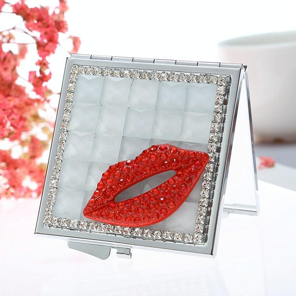 Handmade Diamond Mini Makeup Mirror Portable Double-sided Small Mirror Ruby Red Lips(White Crystal)
