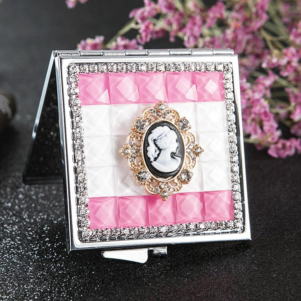 Handmade DIY Diamond Portable Double Sided Folding Mirror Gem Beauty Head(Pink)