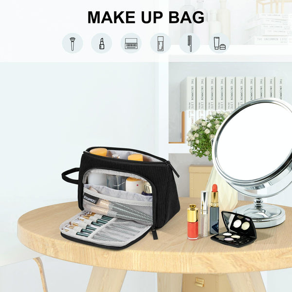 4. Quality Material: This makeup bag for purse made of corduroy and 250D nylon material, It has nice lining, reliable double zippers, zip-top closure.