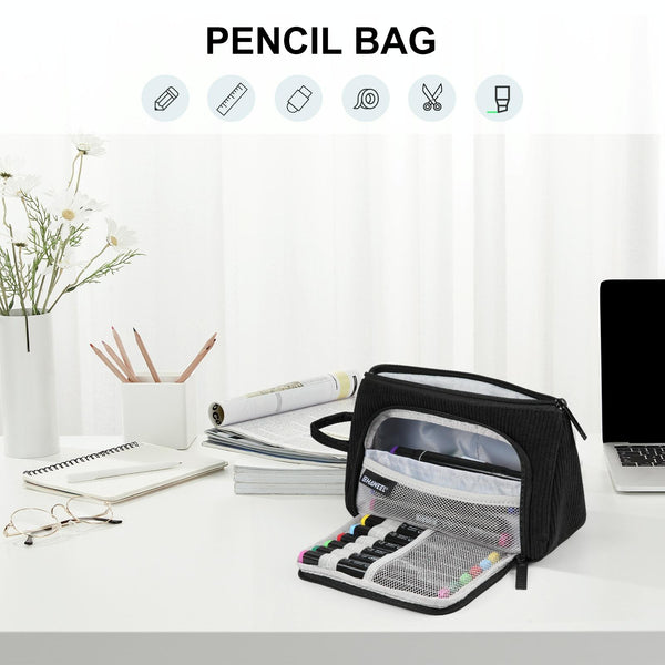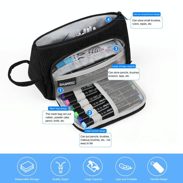 1. Large Capacity: As a pen bag with large storage, have the ability to store and organize multiple pens or pencils even scissors, sticky notes, rubber, tape can be easily stored.