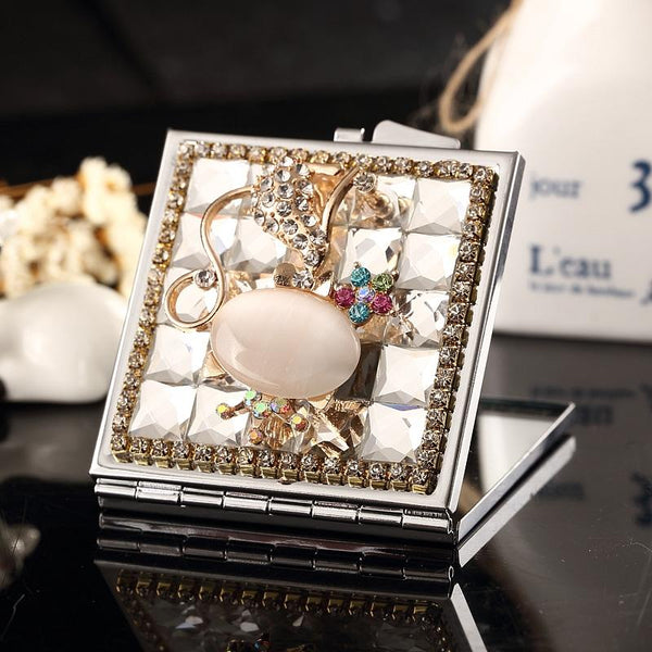 Mini Portable Folding Makeup Mirror Opal Fox With Diamonds(Pink)