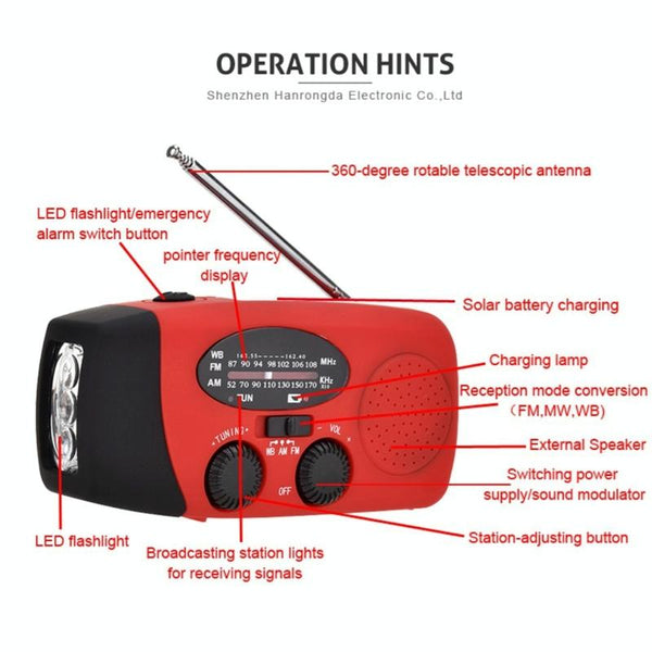 HRD-902 Multifunctional Hand Crank Solar Power LED Flashlight Emergency Alarm FM Radio