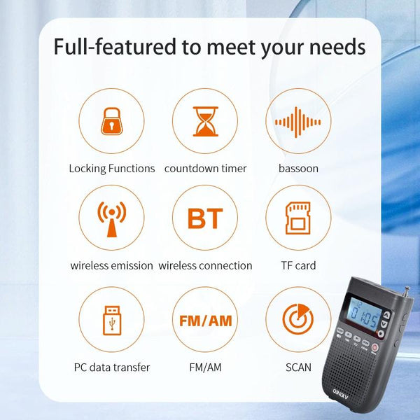 6. Functions: Locking / countdown timer / bassoon / wireless emission / wireless connection / TF card / PC data transfer / FM / AM / SCAN