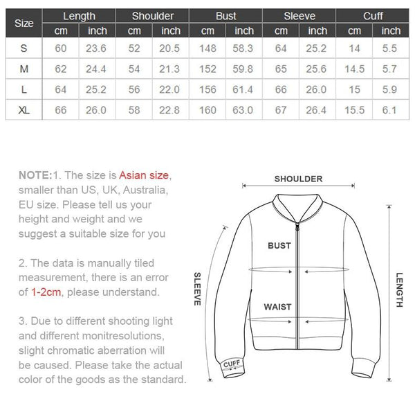 | Size | Clothes Length | Chest | Sleeve Length | Cuff | Shoulder Width | |||||