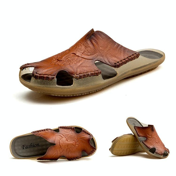 Summer Men Leather Slippers Casual Large Size Flat Beach Shoes, Size: 43(Red Brown)