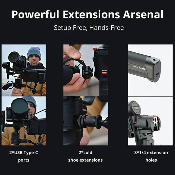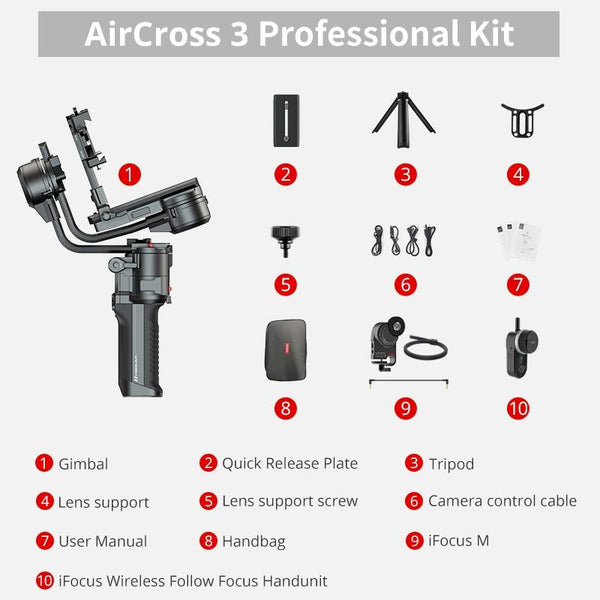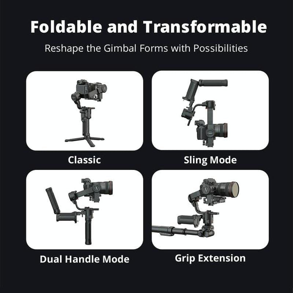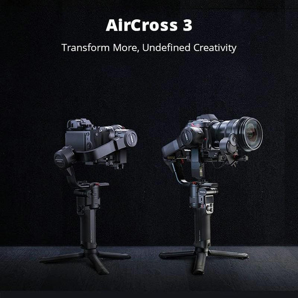 With an updated compact and ergonomic design from AirCross 2, the AirCross 3 3-Axis Handheld Gimbal Stabilizer features enhanced battery life, updated OLED UI, a single start/stop/shutter button, a more durable metal construction, greater stability, enhanced manual control, and a foldable design. The AirCross 3 supports cameras that weigh up to 7 lb, which can be set up in different configurations: Classic mode, Sling mode, and Dual-Handle mode, and can be used with a grip extension such as the optional Slypod for a dolly effect.