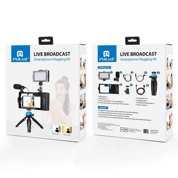 PULUZ 4 in 1 Bluetooth Handheld Vlogging Live Broadcast LED Selfie Light Smartphone Video Rig Kits with Microphone + Tripod Mount + Cold Shoe Tripod Head for iPhone, Galaxy, Huawei, Xiaomi, HTC, LG, Google, and Other Smartphones(Blue)