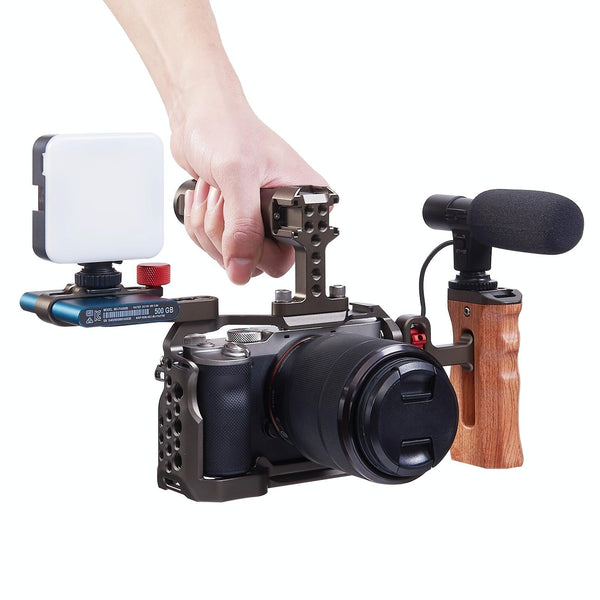 3. The side handle features a cold shoe on the top to mount microphone and led light, also 1/4 inch threaded holes on the top for accessories such as magic arm, ballhead, monitor mount, etc.