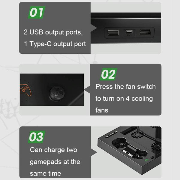 3. There are three expansion ports on the side of the cooling base: 2 USB output ports, 1 Type-C port
