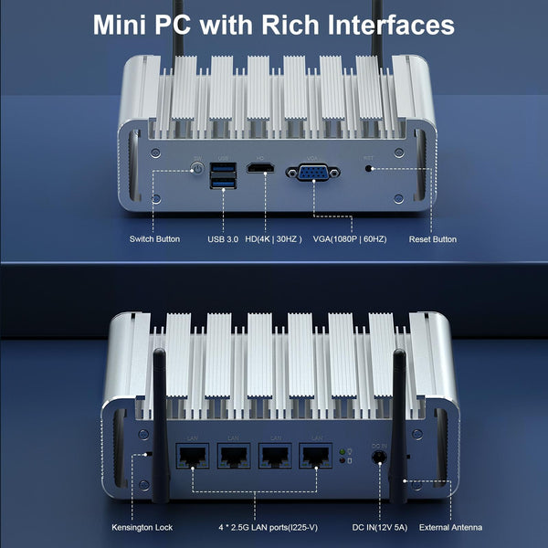 10. I/O interface: 2xUSB3.0, DC input port x1, 4xRJ45, 2x external antenna interface, used for WiFi module/4G module signal gain