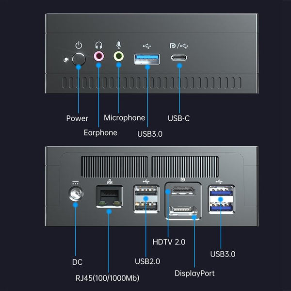 7. Interface: USB3.0 x 3, USB2.0 x 2, HDTV 2.0b x 1, DP1.4 x 1, Type-C x 1, RJ45 x 1, Earphone x 1, Microphone x 1, Power in x 1