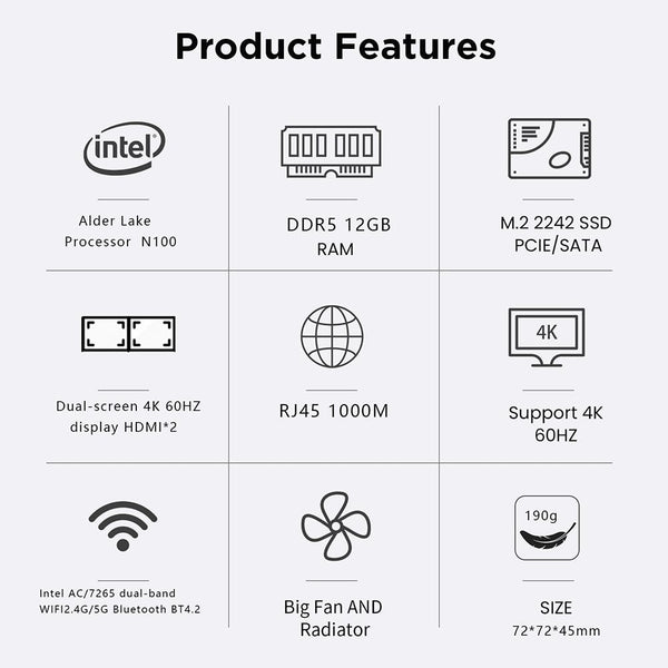 N100/DDR5 12th AlderLake-N100 Dual 4K60Hz Office And Home Mini PC, Spec: 12G+512G /US Plug