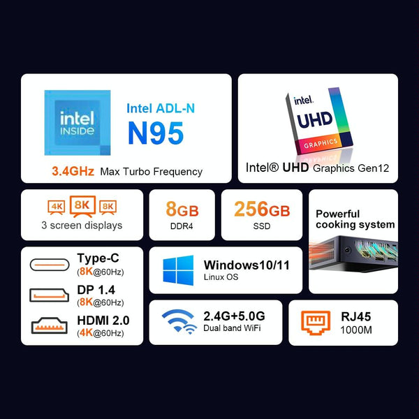1. CPU: Intel Alder Lake-N95, 4 cores 4 threads, 1.10GHz-3.40GHz